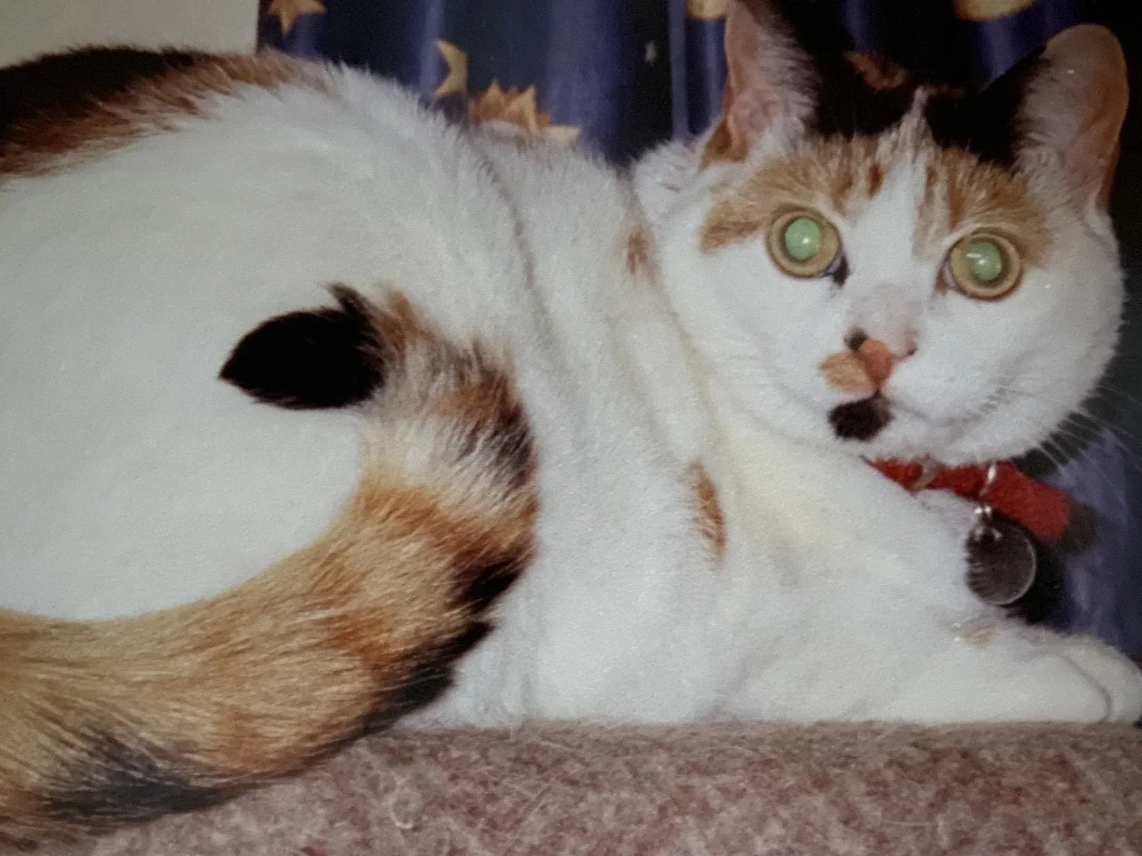 Reevo’s sister, tortoiseshell and white, quieter, more timid and more careful about the road. She came on many holidays with us, mostly to the caravan in Wales, but also to Edinburgh for New Year celebrations. Always gentle and loving, she lived until she was 13.